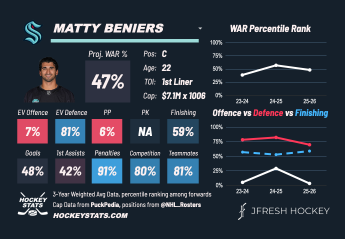 We projected that Beniers would score more than he has. A few 60- to 70-point seasons seemed within his capabilities, but otherwise he has become what most envisioned: a true centre and one of the top defensive players in the NHL.