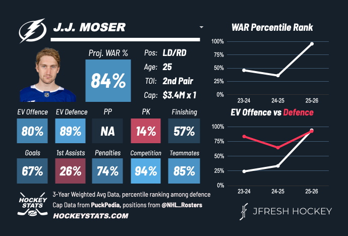 Jon Cooper calls him the eraser. Moser gaps up hard on opponents, barely giving them space, and defends patiently in his zone, taking away options until he can pounce on the puck. His offensive approach — avoiding mistakes, taking shots on net, and distributing passes to his talented teammates — also helps boost his possession metrics. He’s not giving the opposition easy chances and is being rewarded for it.