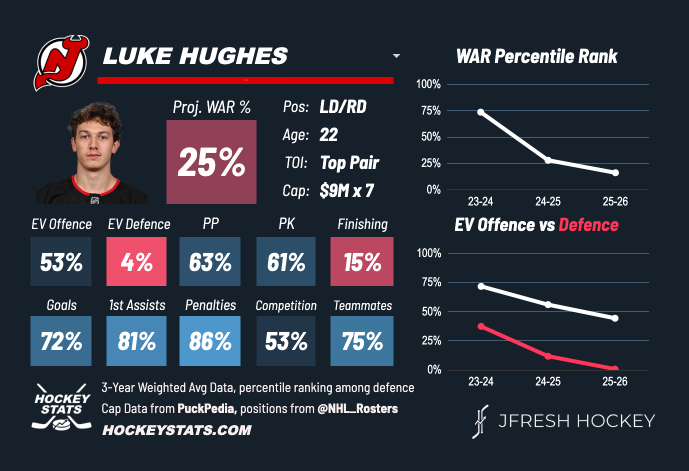Toolsy players placed in large roles tend to continue to develop over their career. Hughes should still prove valuable in a top-four offensive role, matched with highly creative teammates. Borrowing their hockey sense and following the plays they outline, he could facilitate plays and pick up points, but he may always need to be insulated.