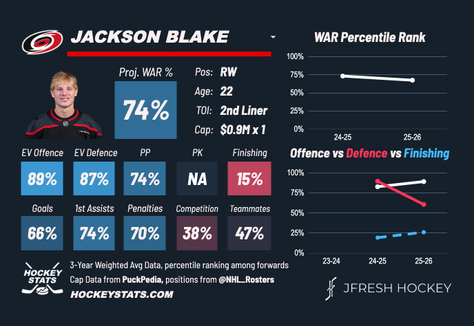 Now, Blake is scoring his share of points, while accumulating elite underlying numbers and looking much better than a 73rd overall or 109th overall prospect. There’s something to be said about Carolina’s system and how it may be boosting some players’ analytical profiles, but even when accounting for that, Blake looks like a top-15 player in the class.