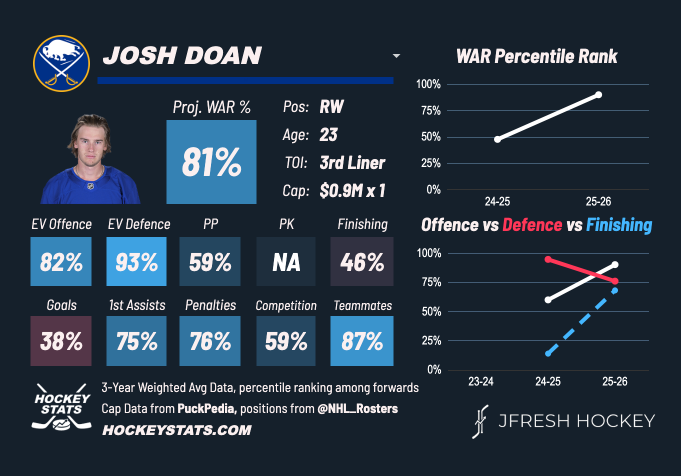 This is not a player we ever expected to rank this high in a re-ranking, but Josh Doan is forcing our hand with the season he’s having in Buffalo. The team is winning and he’s helping push them up the standings.