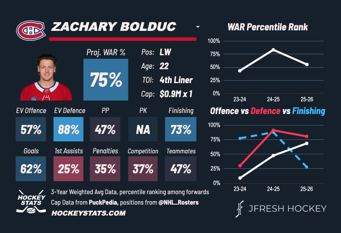 What we didn’t anticipate was that Bolduc would recycle those tools into a checking game and become a legitimate pressure machine, boosting his defensive metrics. Rare are the forwards who manage to completely rework their identity as they develop. If he can maintain his pace of play and put up the occasional goal, he will continue to earn minutes as a bottom-six forward.